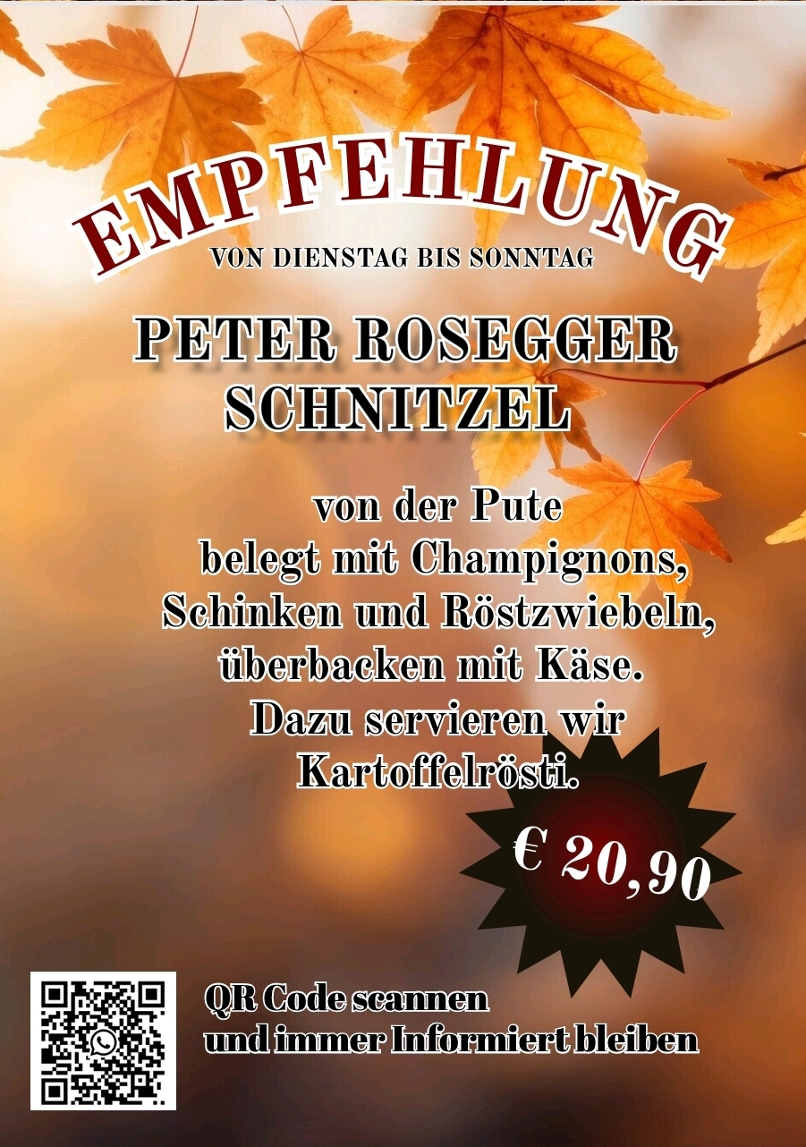 Lassen Sie sich verwöhnen und genießen Sie die vielfältige und österreichische Küche. Einem zünftigen Mittagessen in unserem Haus steht aus unserer Sicht nichts im Weg. In unseren Gasträumen gibt es Gratis-WiFi. Für Raucher haben wir einen eigenen Bereich eingerichtet.